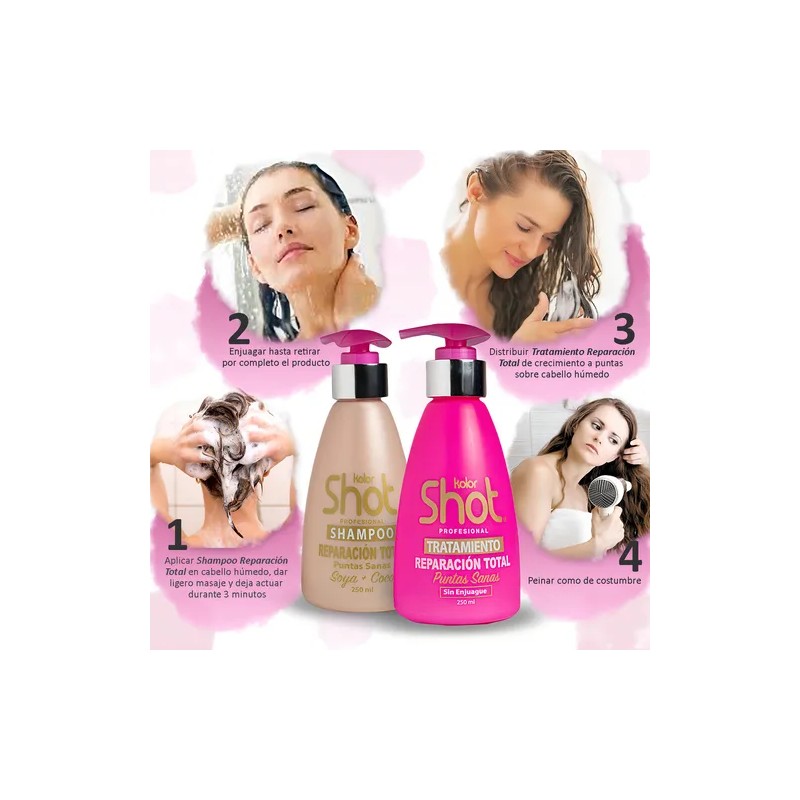 • Lava tu cabello con el shampoo reparación total soya y coco, aplicando una cantidad suficiente sobre el cabello húmedo y masajeando suavemente. Deja actuar durante 3 minutos y enjuaga con abundante agua.