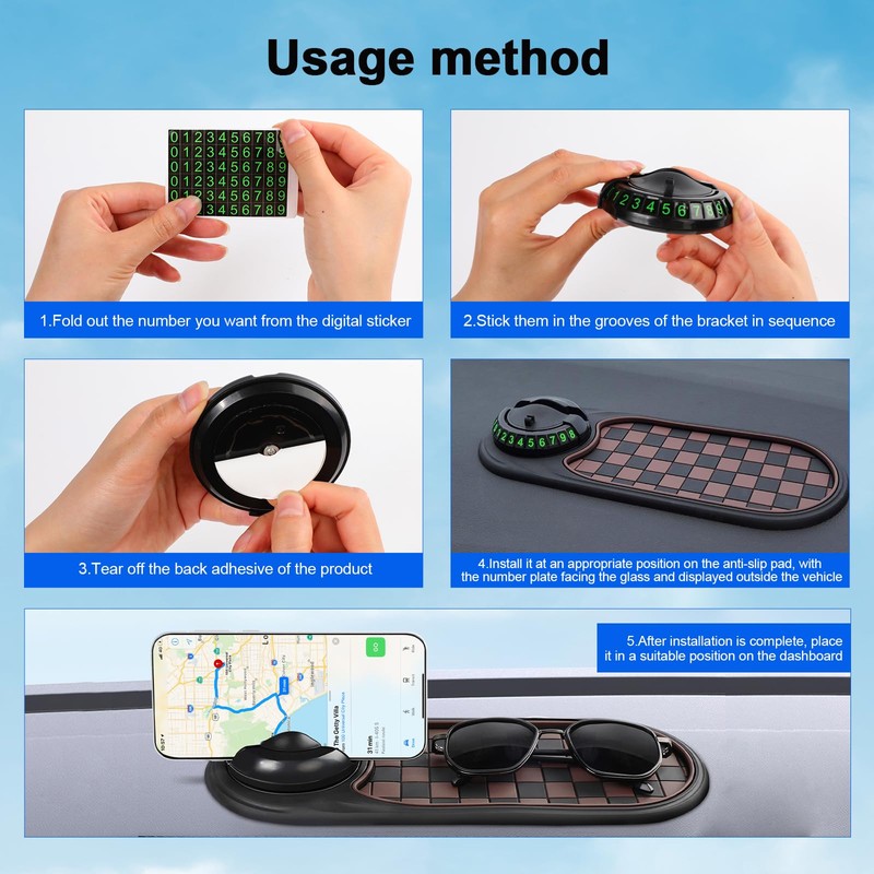 - 【DIY Number Plate】The multifunction car anti-slip mat auto phone holder base of the holder is equipped with a temporary parking number sticker,equipped with 0-9 digits,which can be used to form a mobile phone number. Just rotate it to choose to hide or display.