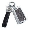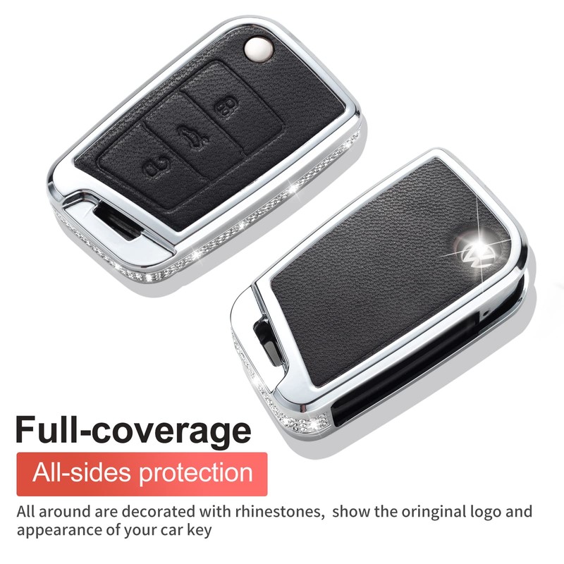 SHANGHONG Compatible with VW Volkswagen Key Fob Cover with Keychain Genuine Leather Crystal Key Case Protector for VW Golf GTI Tiguan Atlas Polo Jetta (Black)
