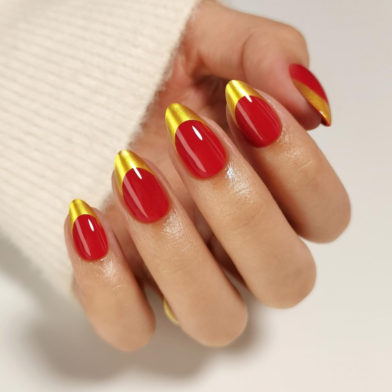 SHANGMENG Red and Gold French Tip Press on Nails Short for Women Gift - Soft Gel Press on Nails Almond with Glue, Fit Perfectly & Natural Glue on Nails in 16 Sizes - 32 Reusable Fake Nails, Red Gold