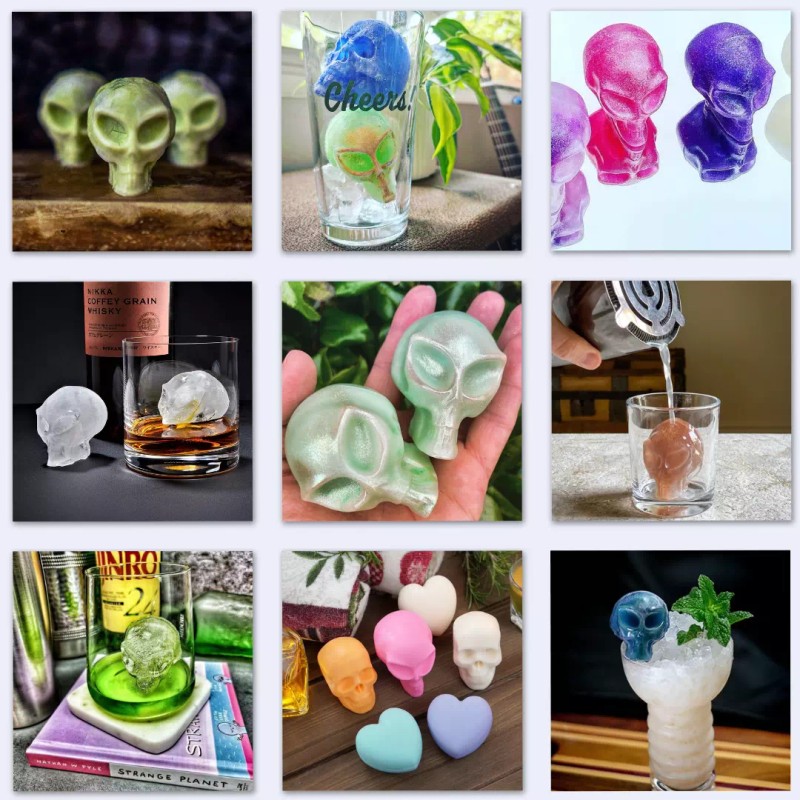 Shaped 3D Silicone Ice Molds! Our molds are perfect for creating not only realistic skull-shaped ice cubes but alien skull-shaped ice cubes and giant spheres that will elevate your drinks to a whole new level.