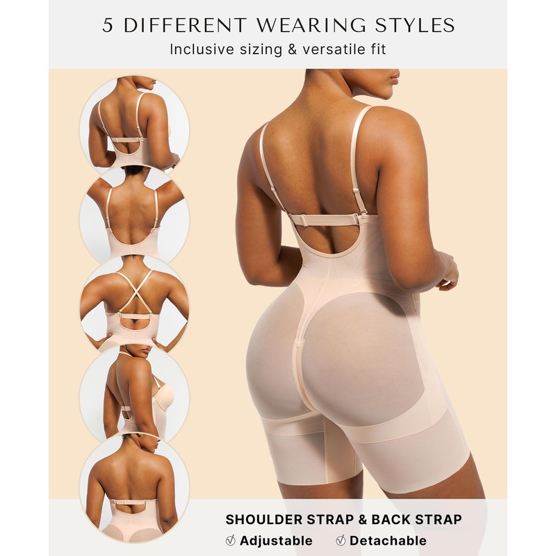 - [Breast Support Bra & Fits More Body Types]: Built-in underwire bra lifts and enhances breasts, while adjustable and detachable shoulder straps let you customize your perfect fit. This women's backless shapewear bodysuit also comes with an additional long strap for wearing around the neck, making it a more versatile option for different occasions.