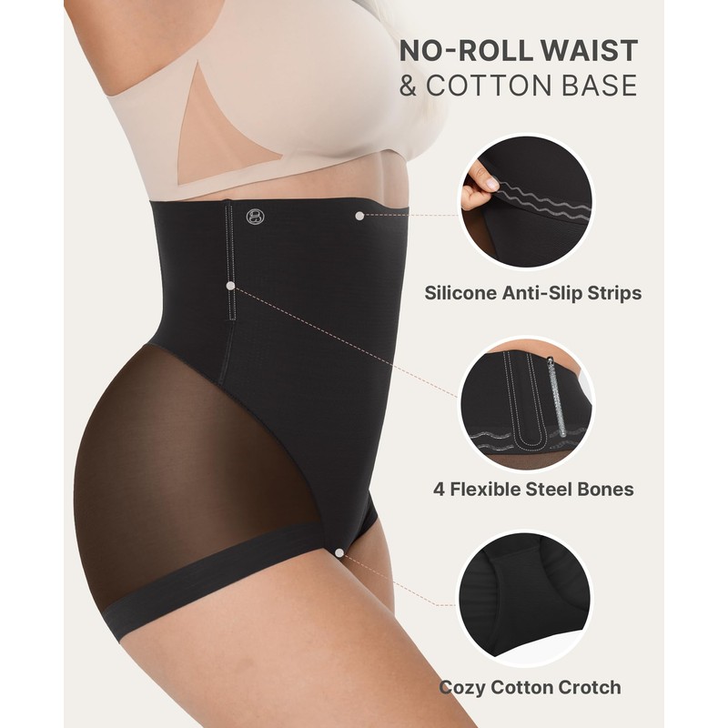- 360° NO ROLL: Double-layer wave-grip strips inside the waistband and four built-in steel bones at sides and back work together to prevent rolling and provide back support. Stay confident and distraction-free with no tugging or adjusting needed, as the shapewear stays put during daily tasks or workouts.