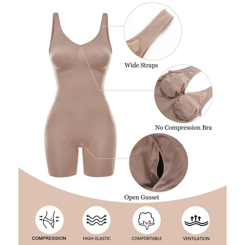 - FUNCTIONAL FULL BODY SHAPEWEAR FOR WOMEN Wide straps and a non-pressing bra for shoulder relief and even support, buttock lift pads for a defined silhouette, thigh compression to avoid curling and an open crotch for easy toilet access