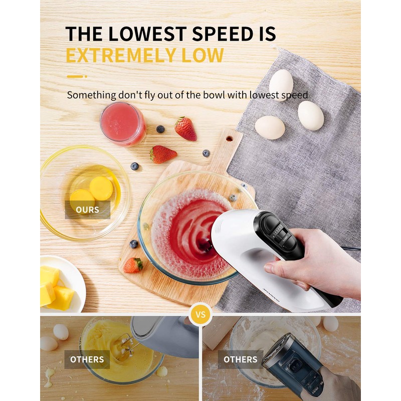 - [Powerful Motor] - With a powerful motor and 5 adjustable speeds to help you whisk, mix and knead and the turbo boost of the hand mixer can help you more efficient and quick.