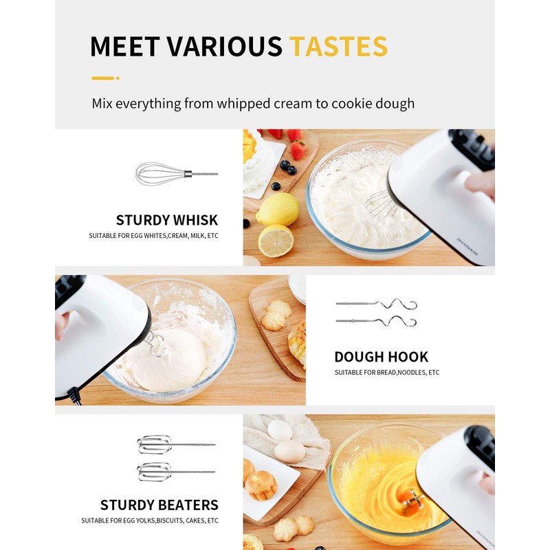 - [Meet All Needs] - This hand mixer has all the functions you need. It has 1*whisk, 2* beaters and 2*dough hook for easy whipping, mixing cookies, brownies, cakes, and dough batters. Meet all your needs in kitchen.