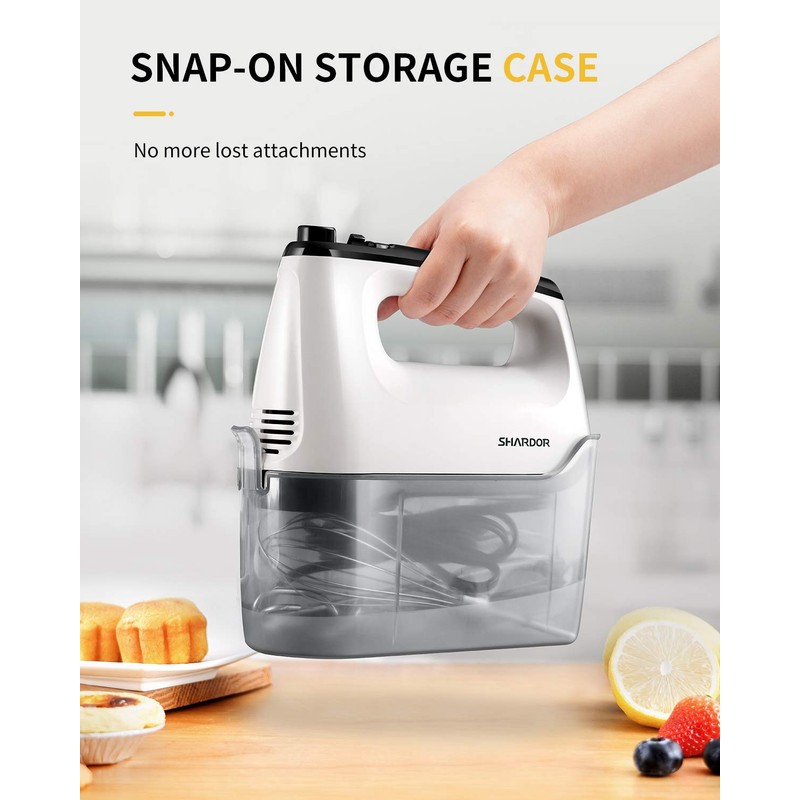 SHARDOR Hand Mixer Electric, 6 Speed & Turbo Handheld Mixer with 5 Stainless Steel Accessories, Electic Mixer for Whipping, Mixing Cookies, Brownie, Cakes, Dough Batters, Snap-On Storage Case, White