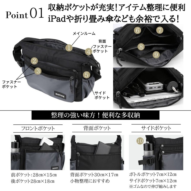 - Lightweight and durable nylon bag: Shoulder bag made with a smooth and comfortable nylon fabric. Repels water and if it gets dirty, simply wipe it off and it will be removed. Durable and easy to clean. A men's bag that can be used for a long time. In addition, it is a lightweight bag that does not strain your shoulders, so it is recommended for those who want to focus on light weight when selecting a bag. W 32cm x H 24cm x D 8cm Zipper pocket front:25cm*15cm,back 26cm*19cm Shoulder strap: Approx. 26.0 - 52.8 inches (66 - 134Cord width: about 3.5cm