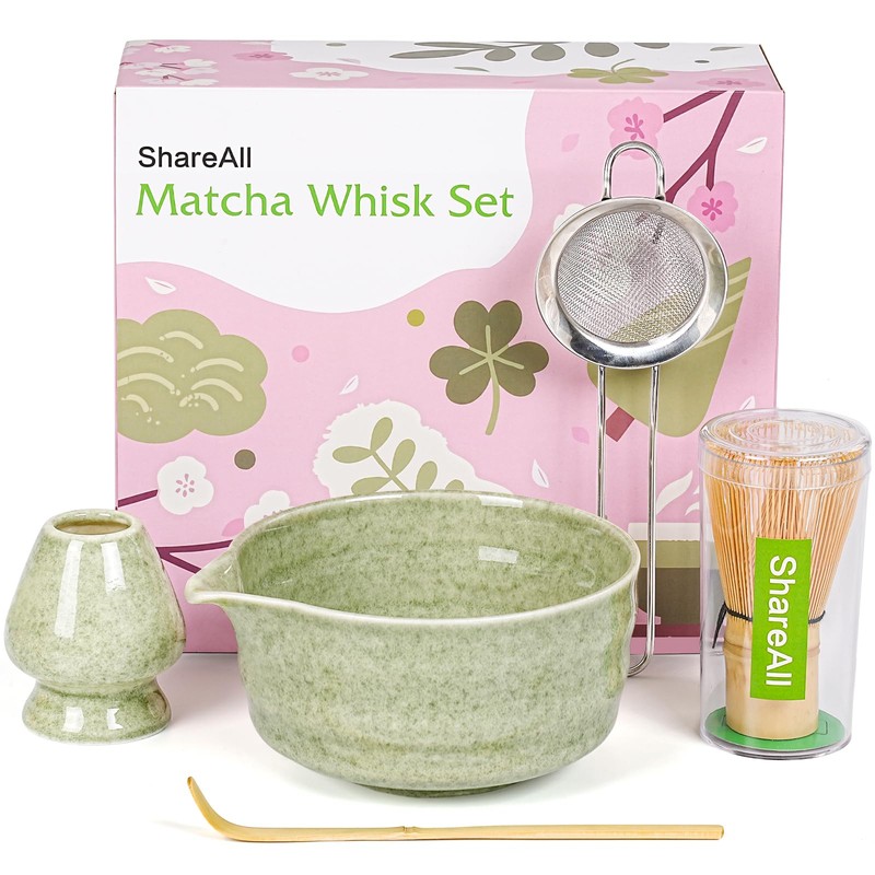 SHAREALL Matcha Whisk Set, 5Pcs Matcha Set, Matcha Bowl with Spout 17oz, Bamboo Matcha Whisk Chasen & Ceramic Holder, Matcha Sifter & Scoop, Matcha Kit for Tea Ceremonial, Ideal Gift (Speckled green)
