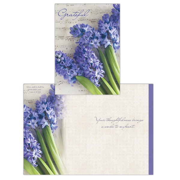 • RELIGIOUS THANK YOU CARD - Includes one greeting card with envelope. Faith-based thank you greeting card features KJV scripture and a beautiful musical hyacinth flower design by artist Claire Brocato.