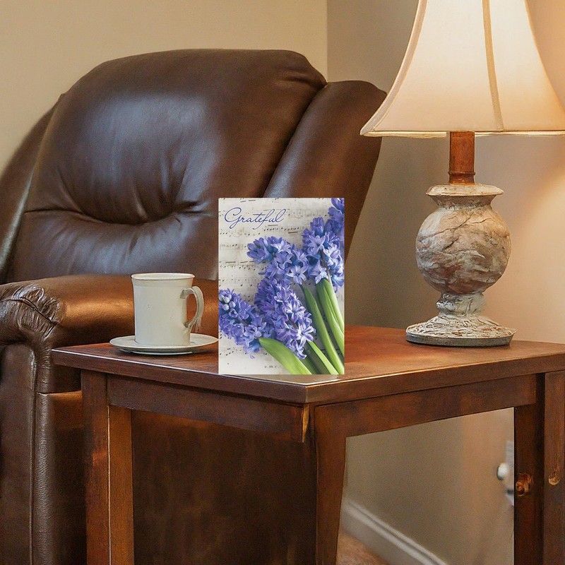 Faith-based thank you greeting card features KJV scripture and a beautiful musical hyacinth flower design by artist Claire Brocato. The inside features King James Version scripture "Give, and it shall be given unto you… Luke 6:38 KVJ." The outside of each thank you card reads "Grateful" and the inside reads "Your thoughtfulness brings a smile to my heart." Each faith thank you card measures approximately 5 x 7 inches. The inside of each card features full color printing that coordinates with the outside design. Our greeting cards are printed on 100% recycled paper using a solar-powered facility in the USA.