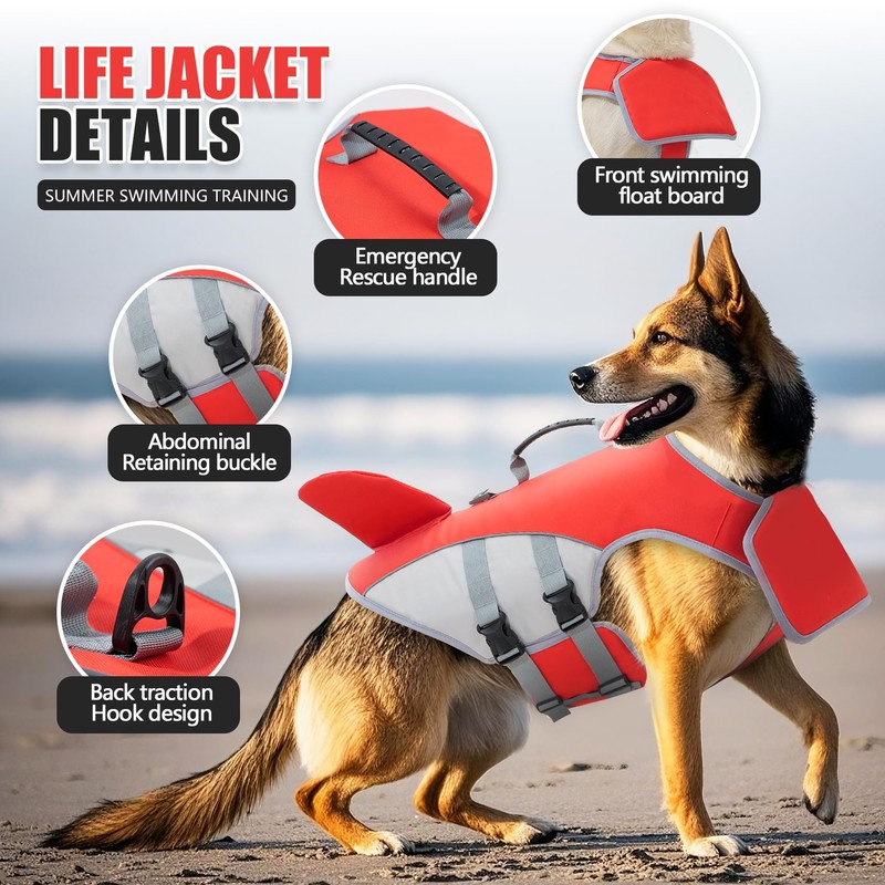 Shark Life Jacket for Dogs, High Flotation Pet Life Vest with Handle, Removable Front Float Dog Safety Lifesaver Red Small