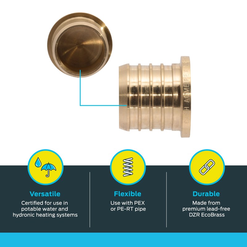 - PEX CONNECTOR: Brass crimp plug is perfect for plugging the end of a PEX pipe with crimp or clamp connection; certified for use with potable, hydronic, and radiant heating applications