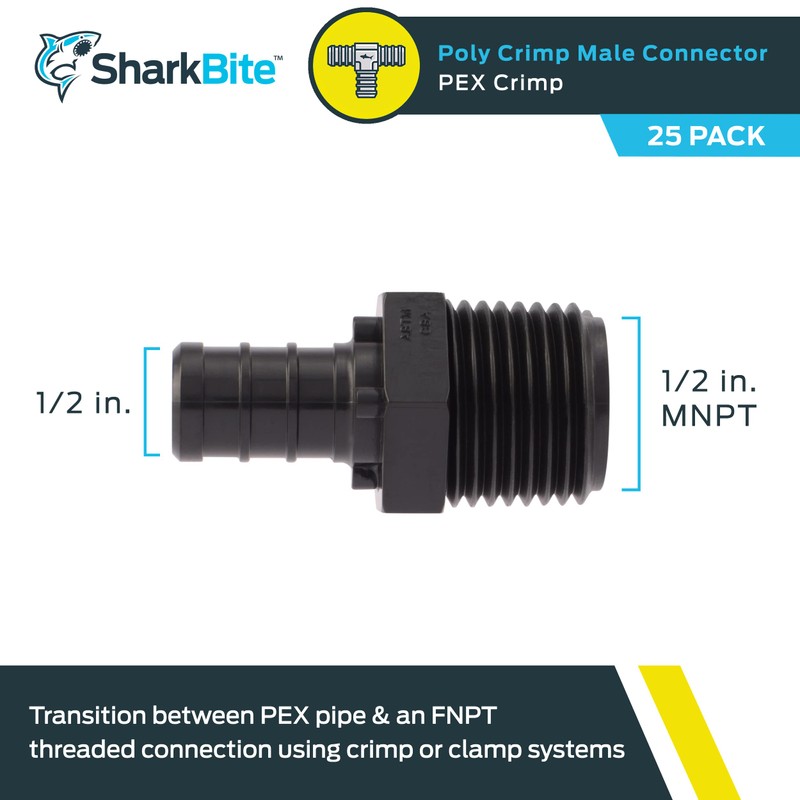 SharkBite 1/2 Inch MNPT Poly Crimp Adapter, Pack of 25, PEX Pipe, PE-RT, UP120