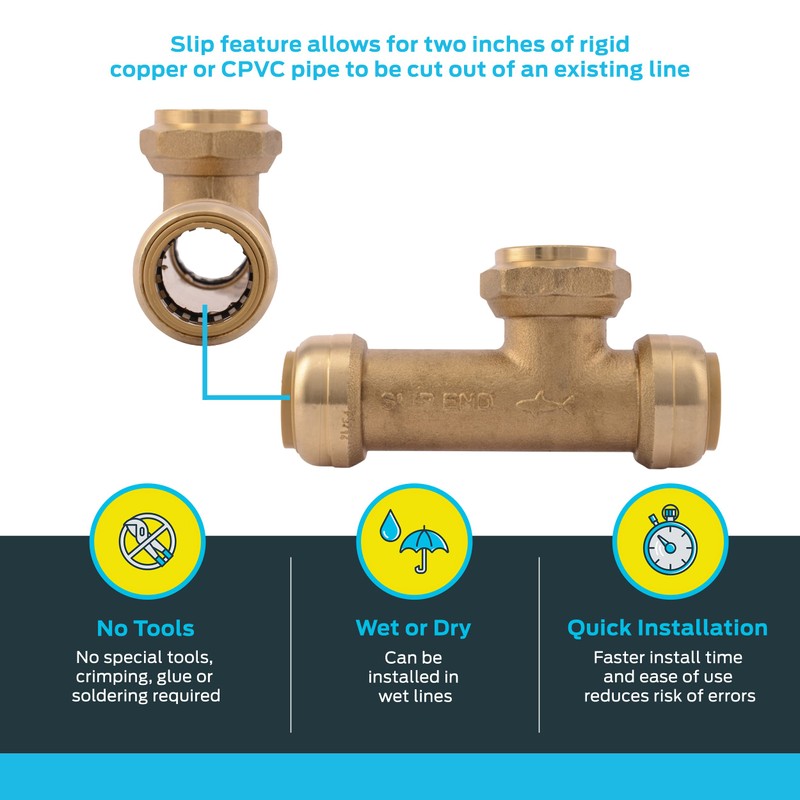 - EASY TO INSTALL: The SharkBite brass push tee with an FNPT thread features a push-to-connect mechanism for a watertight union with no tools, crimping, glue, or soldering required; can be rotated after assembly for easier and faster installation