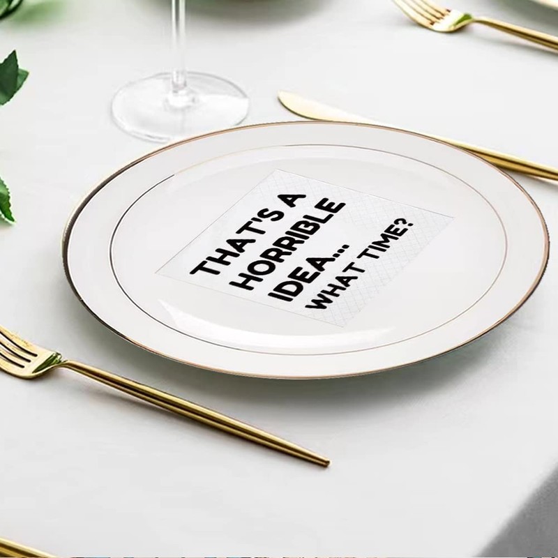 - Servilletas de cóctel con cita divertida: cada paquete tiene 100 servilletas de cóctel con patrones de "That's A Horrible Idea What Time", que son suficientes para satisfacer tus necesidades en la boda; puedes elegir y combinar de acuerdo a tus necesidades
