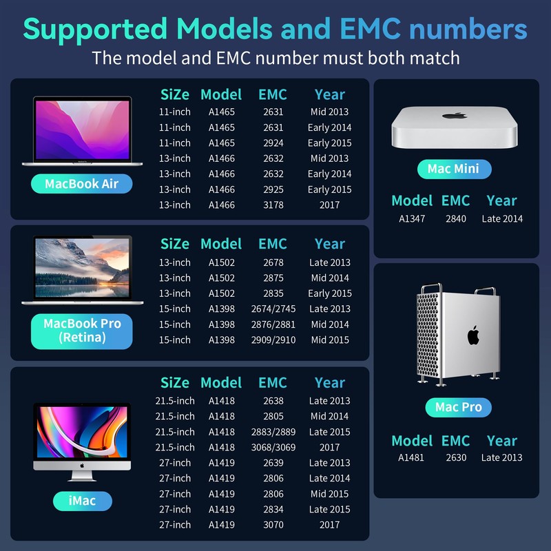 - 【COMPATIBLE WITH APPLE EMC NUMBER】MacBook Air 11" (2631, 2924), MacBook Air 13" (2632, 2925, 3178), MacBook Pro 13"(2678, 2835, 2875), MacBook Pro 15" (2674, 2745, 2876, 2881, 2909, 2910), iMac 21.5" (2638, 2805, 2883, 2889, 3068, 3069), iMac 27" (2639, 2806, 2834, 3070), Mac Mini (2840), Mac Pro (2630).