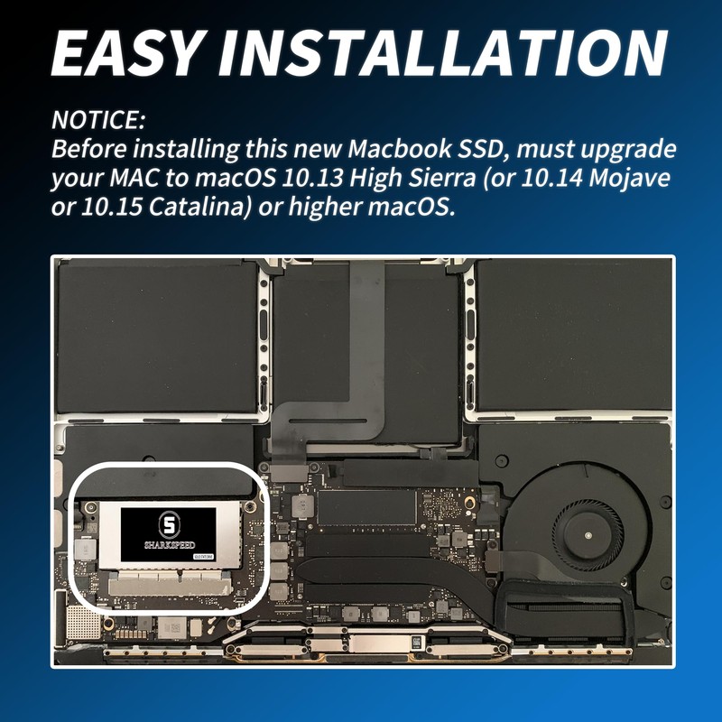 - Important notes: Before installing this new Macbook SSD, you need to upgrade your Mac to macOS 10.13 High Sierra (or 10.14 Mojave or 10.15 Catalina) or higher. These operating system versions include EFI firmware updates for Mac. Without the update, the new SSD will not be recognized. Note: We pre-installed the system for the A1708 SSD.