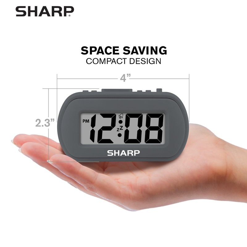 - The Sharp (SPC483CAMZ) digital alarm clock measures 4” (L) * 1.7” (W) * 2.3” (H) inches, small and light. It is an easy cordless battery operated alarm clock, powered by 2 - AAA batteries (not included), features an easy to read clear display, easy for kids, teens to use, basic bedroom bedside table desk gift alarm clock.