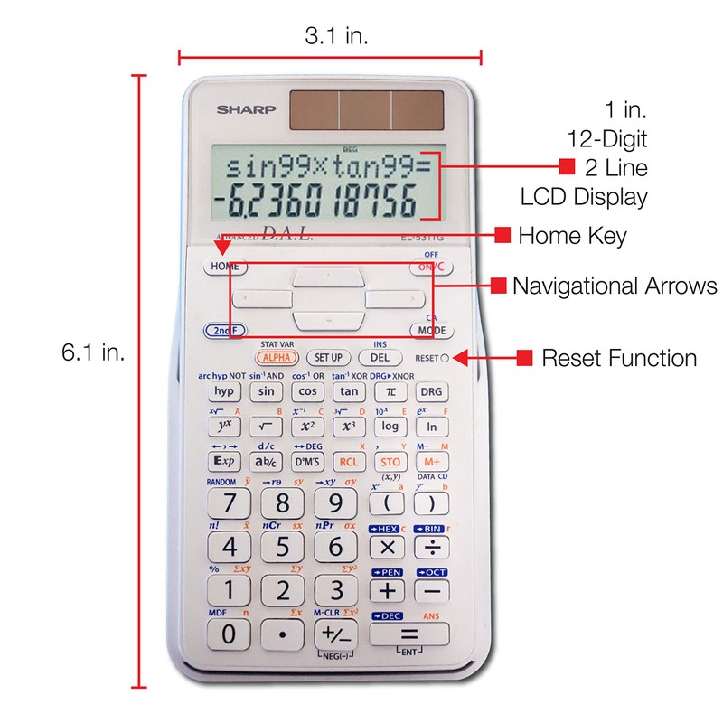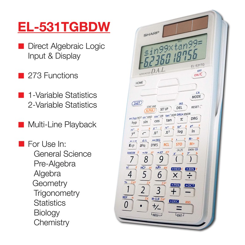 EL-531TGBDW model is perfect for students studying general math and science, pre-algebra, algebra, geometry, trigonometry, statistics, biology, and chemistry and is comparable to the ti-30iis. This calculator performs 273 scientific, math, and statistic functions. This EL-531TGBDW features a sleek White on White design. This calculator utilizes a 2-line display featuring an exponent symbol and direct algebraic Logic (D.A.L.), which allows users to enter the elements of an expression in the exact order that they appear when written. The home key allows users to start fresh from any screen. EL-531TGBDW has eight temporary memories, one independent memory, and one last answer memory. This calculator also allows equation editing & playback, 1 & 2 variable statistics, normal & Stuart modes, six regression types, and n-base calculations: hex, bin, dec, oct, pen. Other functions include: logarithms, reciprocals, powers, roots, factorials, trigs, and hyperbolic trigs. Includes a 3D light reflecting, protective hard case and operates on hybrid power (solar and battery).