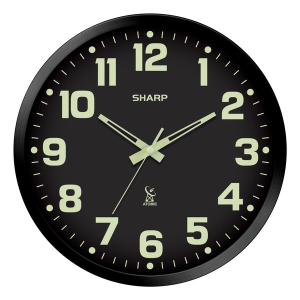 Sharp Sharp Glow in The Dark Atomic Analog Wall Clock - 12" Clock with Black Frame - Sets Automatically - Battery Operated - Easy to Read - Easy to Use C See Day or Night!