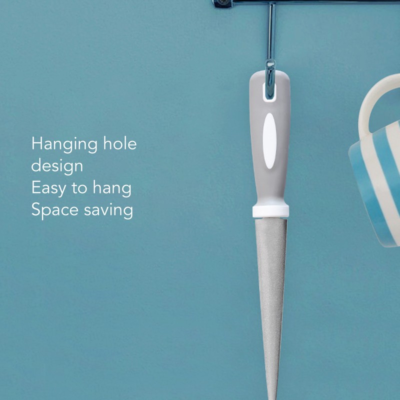 1、NON SLIP AND DURABLE: Sharpening steel has a soft plastic non slip handle, non slip and no drag, and add a segmented design between the handle and the bar body, which is stronger and more durable 2、COMFORTABLE FEEL: The knife sharpener adopt ergonomic design handle design, feel comfortable and dexterous, with incisive blade 3、EFFICIENT AND PRACTICAL: Knife sharpener is lightweight and easy to use, ensuring efficient, incisive sharpening of dull knives and tools, and extending the service life of the tool 4、HANGING HOLE DESIGN: Knife sharpener rod is easy to hang, vertical hanging hole, hanging does not take up space 5、EVEN EMERY: Sharpening rod has an emery surface with uniform grit and is suitable for a variety of tools