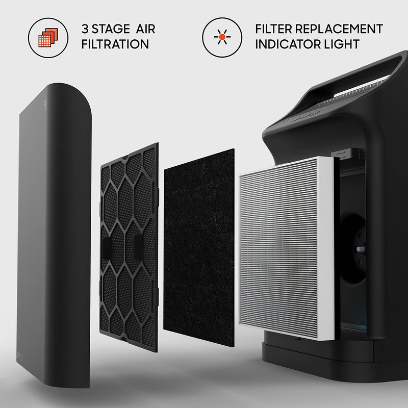 - 3-STAGE FILTRATION: The Pre-Filter purifies the air from larger particles. The True HEPA Filter effectively filters the allergens, and the Activated Carbon Filter captures odors and prolongs HEPA Filter life.