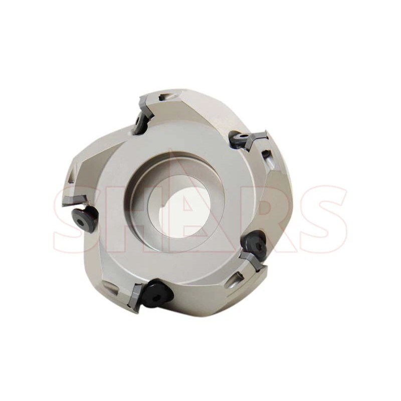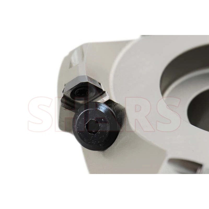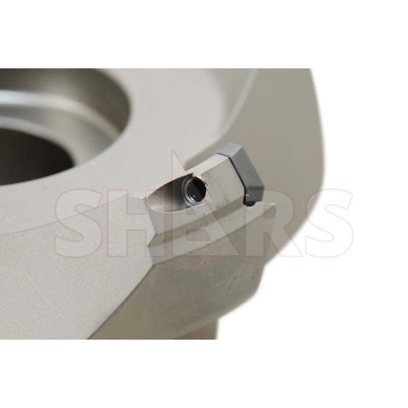 Benefit from the 45 degree lead angle allows an increase of feedrate by 50% over 90 degree face mill and also allows this face mill to used on smaller horse power mills. It uses industry standard SEAN / SEKN / SEKR 42 (ISO 1203) insert which has a positive 20 degree clearance angle. The insert pockets are designed to be 19 degree positive inclined to minimize vibration and allowing fast cutting and lowering cutting noise.