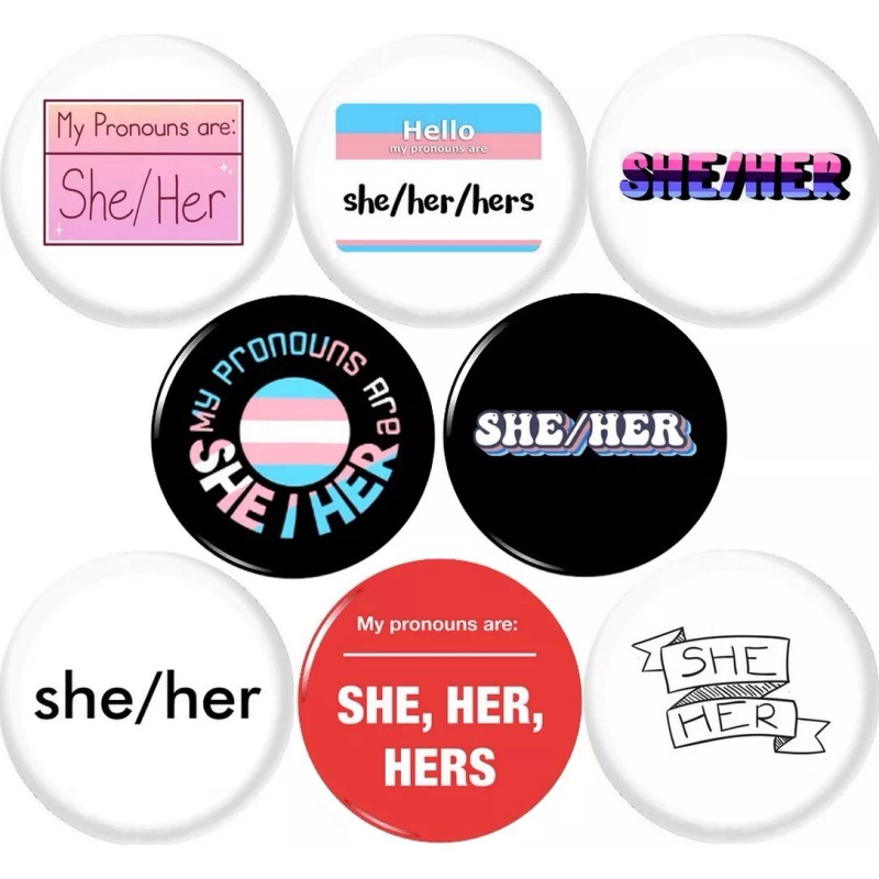 SHE HER PRONOUNS x 8 NEW 1 inch (25mm) button pins badge gay lesbian trans they