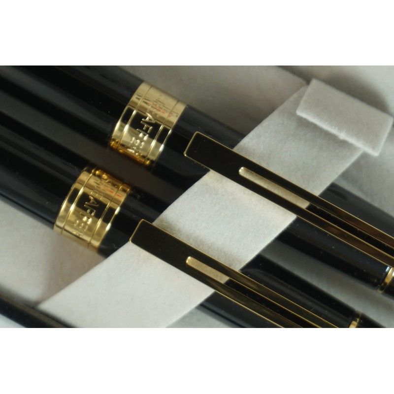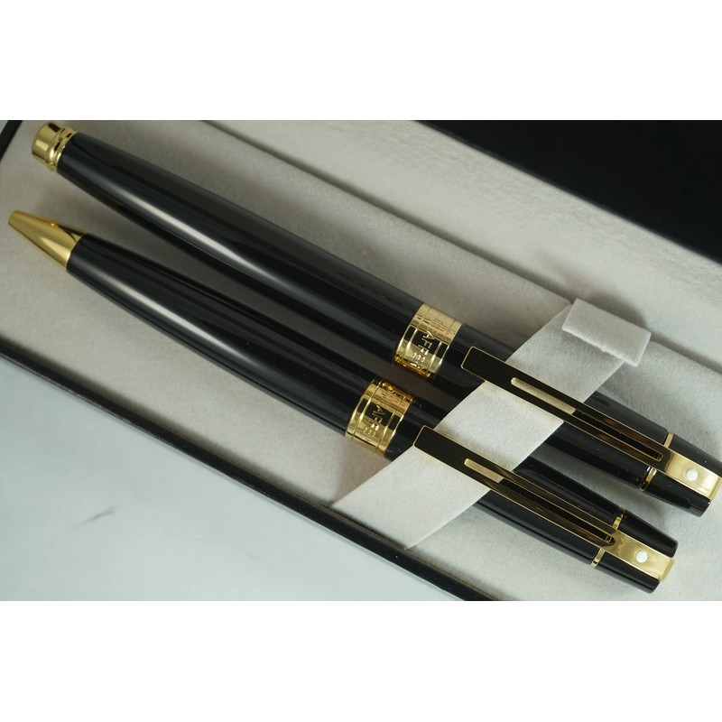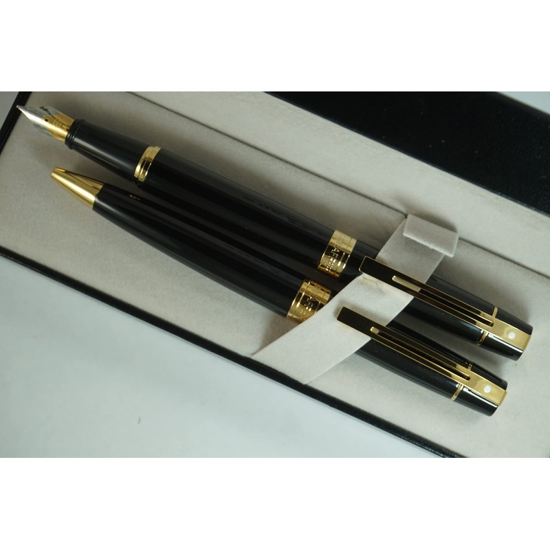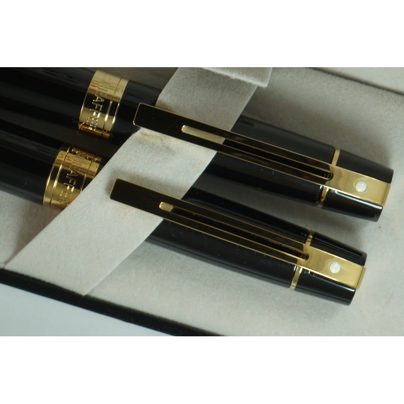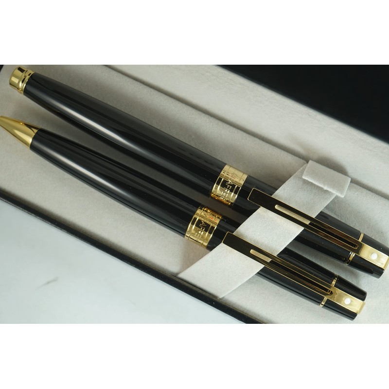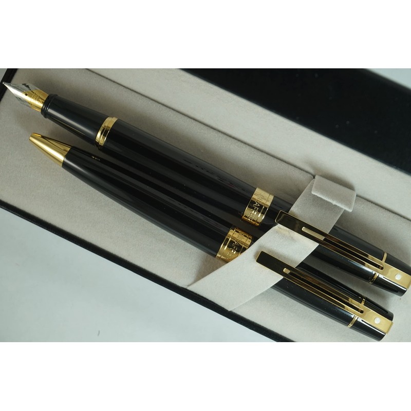 Sheaffer 300 Duo Black Lacquer and Gold Appointments Limited Series with Signature white dot of Excellence and wide band Medium Point Fountain Pen and Ballpoint Pen set.