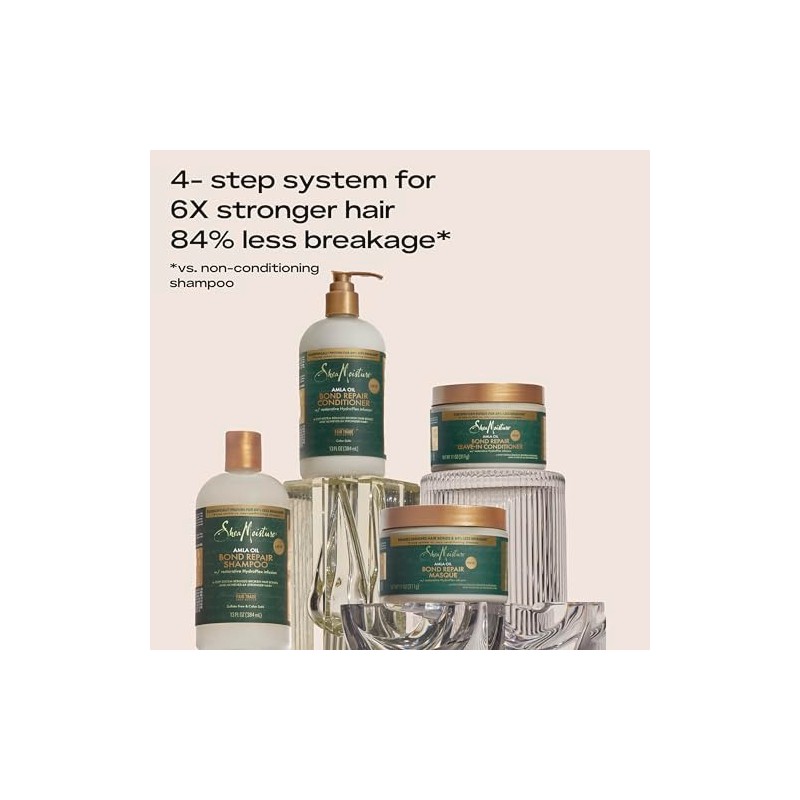 Stronger, healthier hair is just four simple steps away with our 4-Step Bond Repair System, infused with restorative HydroPlex infusion for 84% less breakage* and 6X stronger hair*. Blended with Amla Oil, Fair Trade Shea Butter, and our unique Amino Blend, Bond Repair Masque is designed to repair signs of damage, specifically in curly, coily hair. Transform damaged, brittle hair by adding shine, softness, and 13X ultra moisture.* Start by gently cleansing with Bond Repair shampoo. Then, apply Bond Repair Conditioner from roots to tips, raking it through your hair with your fingers or using a comb for extra detangling. Leave conditioner in hair for three minutes and rinse. For extra moisture, apply the Bond Repair Masque, and leave in for five minutes before rinsing. Finally, apply Bond Repair Leave-In Conditioner to strengthen and hydrate your hair all day. We are natural, sustainably produced goodness. Hair care made with love for you and your body. SheaMoisture is pioneering fair trade through Community Commerce at home and abroad. OUR SheaMoisture is the legacy of Sofi Tucker, a pioneering mother of four and an entrepreneur, who sold Shea Butter, African Black Soap and homemade beauty preparations in Sierra Leone in 1912. We honor her vision by continuing to formulate with Raw Shea Butter handcrafted by women in Africa. With every purchase, you show support of our mission to reinvest back in our communities. *vs non-conditioning shampoo *Repeated Grooming Technical Study #23-019; Conducted April 2023