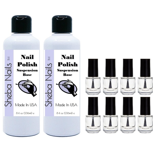 Sheba Nails Nail Polish Mixing Suspension Base 2 Pack of 8 oz (16 oz total) PLUS 8 count Mini Empty Nail Polish Bottles- DIY Make Your Own Nail Polish with Suspending Nail Polish Base