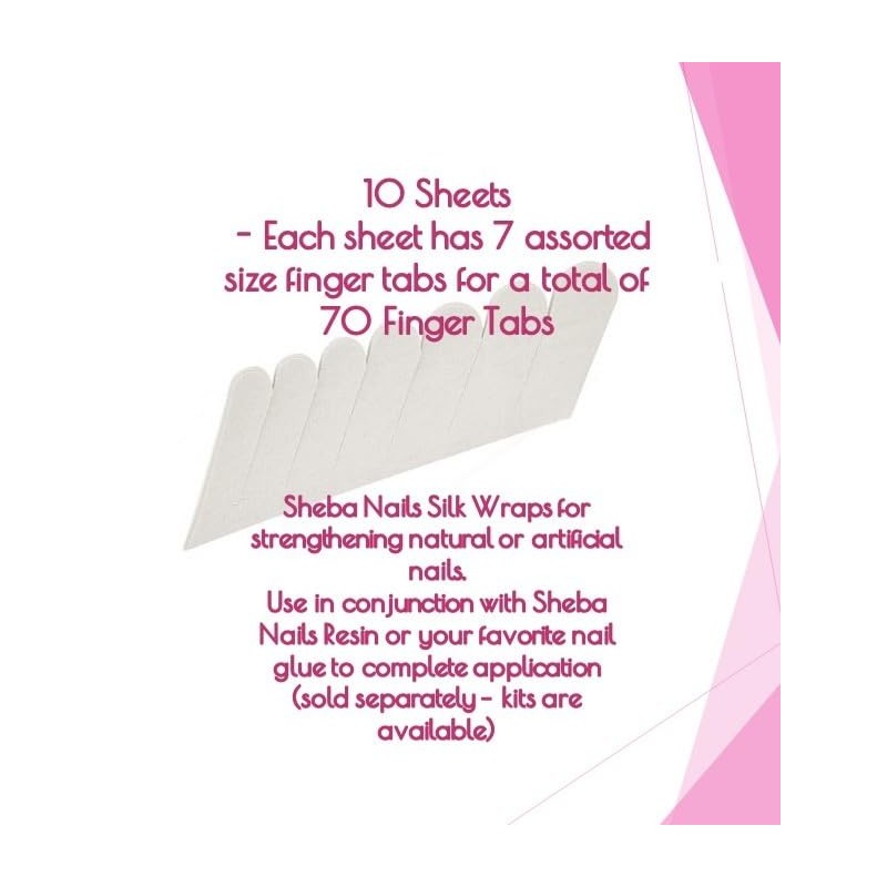 Silk Nail Wrap is a traditional way to add strength to both artificial and natural nails. Precut - 10 sheets (7 fingers per sheet) of self-adhesive silk allows for ease of application. Use in conjunction with Sheba Nail Resin (sold separately) for the ultimate bond. Add strength to the nails or repair broken nails