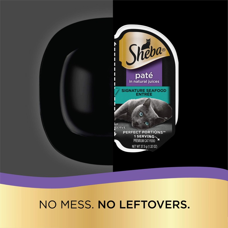 - Contains twenty-four (24) 2.6 oz. twin pack trays (48 servings total) of SHEBA PERFECT PORTIONS Paté Wet Cat Food, Signature Seafood Entrée