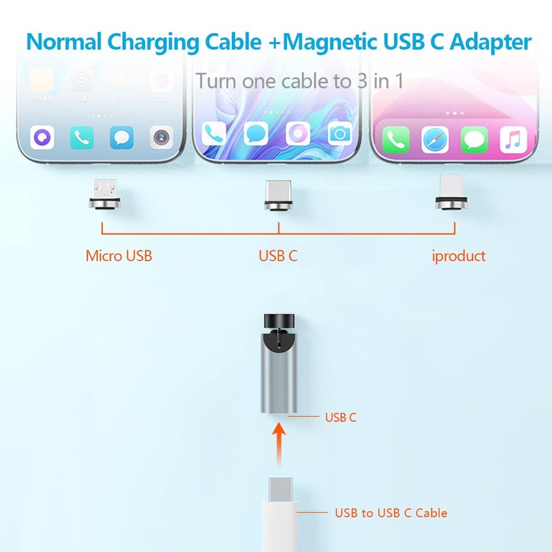 - 🌈Turn USB to USB C Cable to 3 in 1🌈 540 degree rotating magnetic USB C adapter comes with 3 types of magnetic connectors including USB Type C, Android Micro USB, and i-Product tips.❗ Notes: 540° rotation usb c adapter Only works with USB to USB C charging cable NOT for USB C to USB C charging cable.