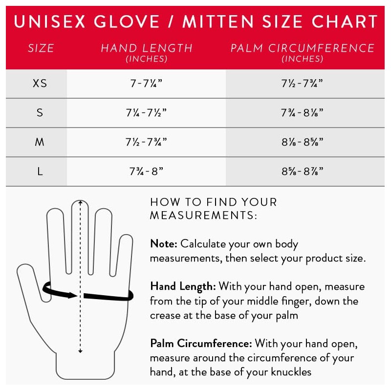 • Extra Small: Hand Length = 7" - 7.25"; Small: Hand Length = 7.25" - 7.5"