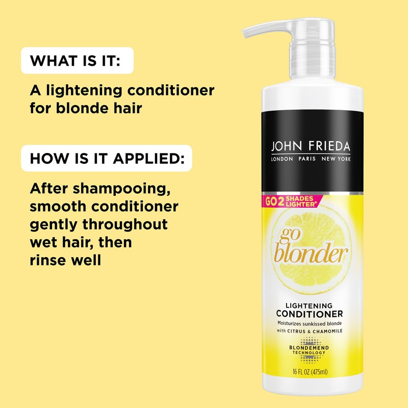 - Ingredientes activos: el acondicionador John Frieda Sheer Blonde Go Blonder está formulado con nuestros cítricos y manzanilla, y nuestra tecnología BlondMend