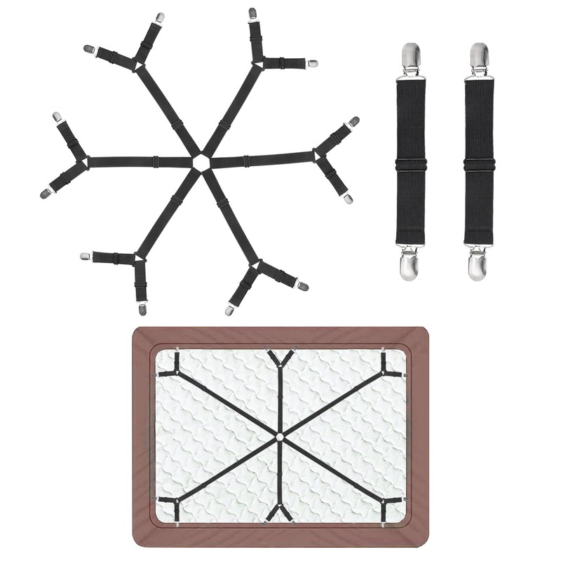 Sheet Fastener Kit with 6 Way Cross Sheet Clips and Non Slip Clip Adjustable Elastic Bed Sheet Holder Straps Fitted Sheet Suspenders Grippers for Round and Square Mattresses(Black)