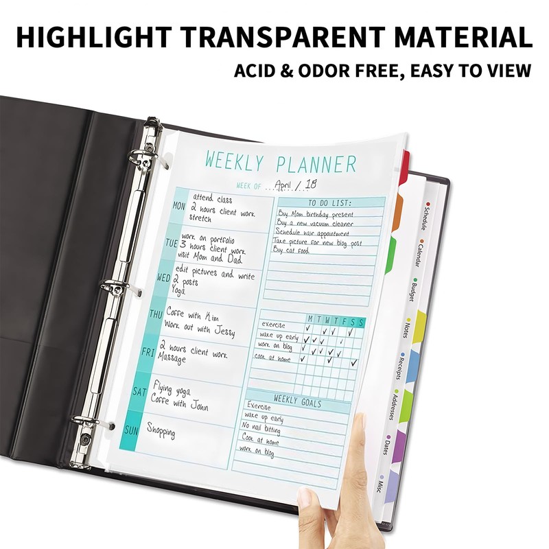 - Sheet Protectors: Fit size for 8.5 x 11 inch sheet paper (standard letter size), total 100 sheets which can meet our daily use. The sheet protectors fit standard 3 ring binder