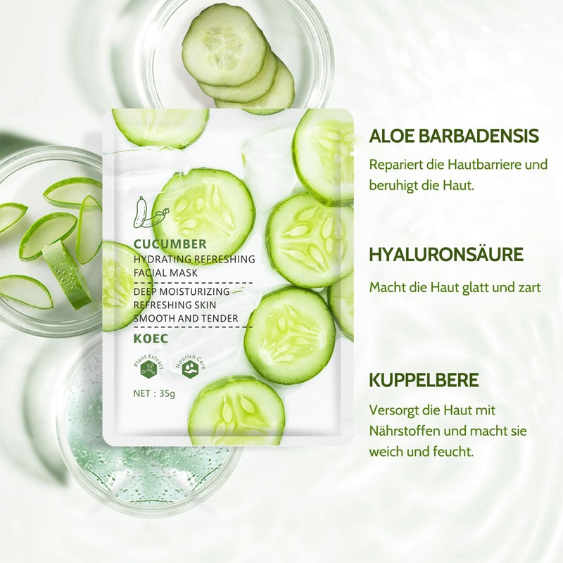 - 🥒Natürliche Pflege: Hergestellt aus hochwertigen, natürlichen Inhaltsstoffen, bietet die Gurken tuchmaske eine sanfte und dennoch effektive Hautpflege, die Ihrer Haut gut tut.