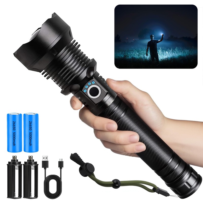 Upgrade Your Gear with the Ultimate Rechargeable LED Flashlight Discover the high-lumen, super bright flashlight designed for reliability and performance. Whether you’re camping, facing a home emergency, or need a tactical flashlight for professional use, this handheld flashlight delivers unmatched brightness and durability. Key Features & Benefits: High Lumen, Super Bright Beam: Powered by an advanced LED chip, this bright flashlight offers long-range visibility, making it ideal for hiking, hunting, and nighttime activities. 5 Lighting Modes & Zoomable Focus: Switch between high, medium, low, strobe, and SOS modes. The adjustable beam transitions from a wide floodlight to a focused spotlight, perfect for tactical use or everyday tasks. Fast USB-C Recharging: Equipped with a built-in power display and high-capacity batteries, this USB-C rechargeable flashlight eliminates the need for disposable batteries. Enjoy up to 14 hours of runtime on a single charge. Rugged & Waterproof Design: Crafted from aircraft-grade aluminum alloy, this IPX6 waterproof flashlight withstands shocks, dust, and harsh weather. Its anti-slip grip and compact size make it easy to carry anywhere. Ideal for Multiple Scenarios: From camping and emergencies to security and self-defense, this versatile flashlight is a must-have for homeowners, outdoor adventurers, and professionals. Specifications: Material: Aluminum Alloy Beam Modes: High, Medium, Low, Strobe, SOS Waterproof Rating: IPX6 Battery Type: Built-in rechargeable (USB-C) Runtime: 4–14 hours (varies by mode) Included Accessories: Lanyard for portability Why Choose This Flashlight? Professional-Grade Brightness for Any Situation As one of the brightest flashlights available, it combines power, portability, and practicality. Whether you need a small flashlight for your pocket or a high-powered light for adventures, this rechargeable LED flashlight is your go-to solution. This high lumen rechargeable flashlight provides exceptional visibility in darkness, whether you’re camping in the wilderness, navigating a blackout, or signaling for help. The adjustable tactical zoom lets you switch instantly between a wide floodlight (for close-range tasks) and a focused spotlight (for long-distance visibility). Built for Reliability Fast USB-C Charging: No more waiting—recharge in hours, even on the go. The battery indicator ensures you’re always prepared. Rugged & Waterproof: IPX6-rated housing withstands heavy rain, drops, and extreme conditions. The anti-slip grip ensures secure handling Emergency-Ready: SOS strobe mode meets survival needs, while the durable aluminum body doubles as an emergency tool. Perfect for Outdoor & Home Use From backpacking trips to storm-preparedness kits, this flashlight balances high performance and portability.