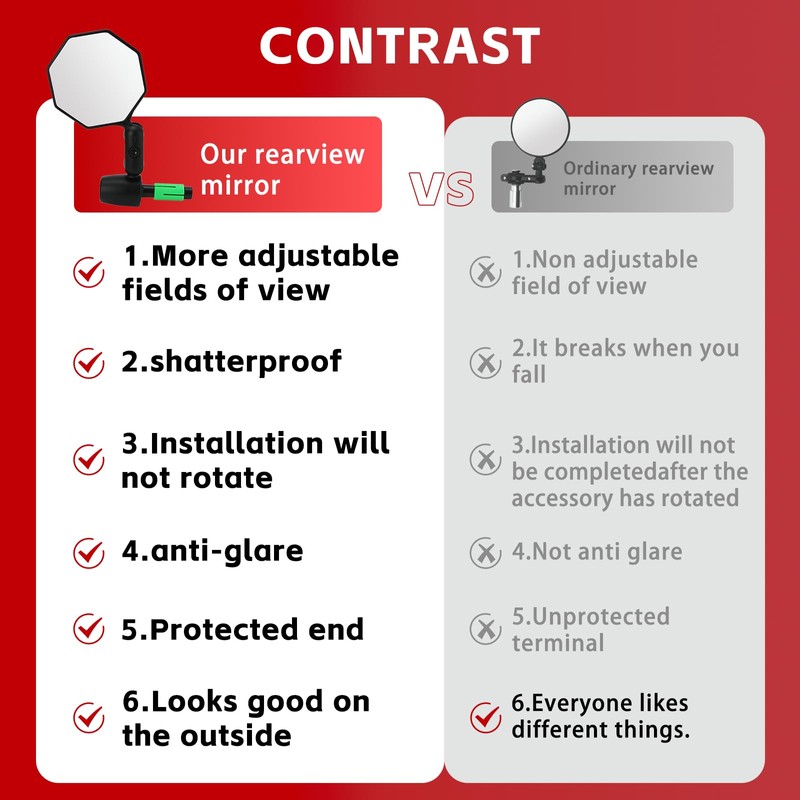 - The mirror is fully adjustable, features a shatterproof design, and comes with a sturdy aluminum alloy bar end. It helps protect the handlebars and mirror in case the motorcycle falls while stationary.