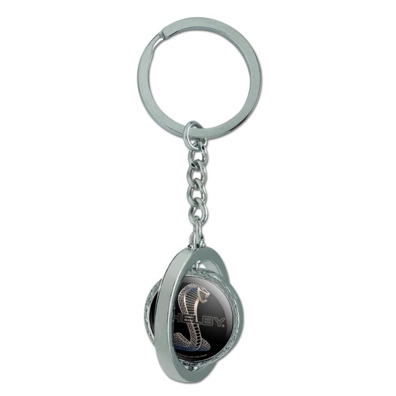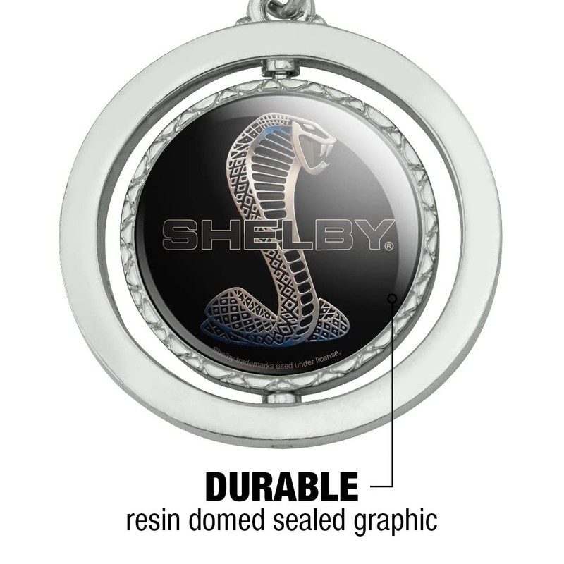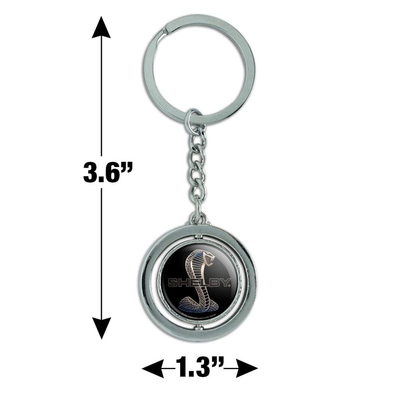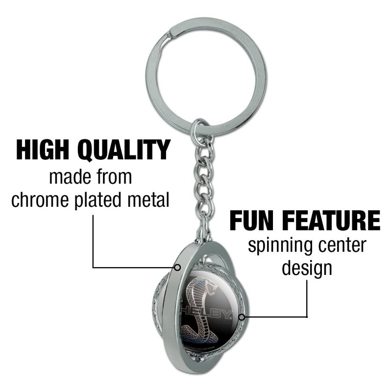 Shelby Cobra Logo keychain will help you make a statement with this truly unique keychain! The center circle with the cool design shown spins completely around. The keychain is chrome plated metal and double-sided with the resin-topped design. The round part of the keychain is approximately 1.3" (3.3cm) in diameter. Sold individually.