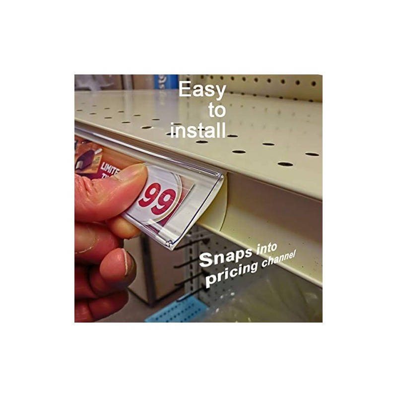 • Application - These clear price channel strips mount easily to standard 1-1/4" price channel by snapping into place. No adhesive is required for installation, making them extremely easy to apply.