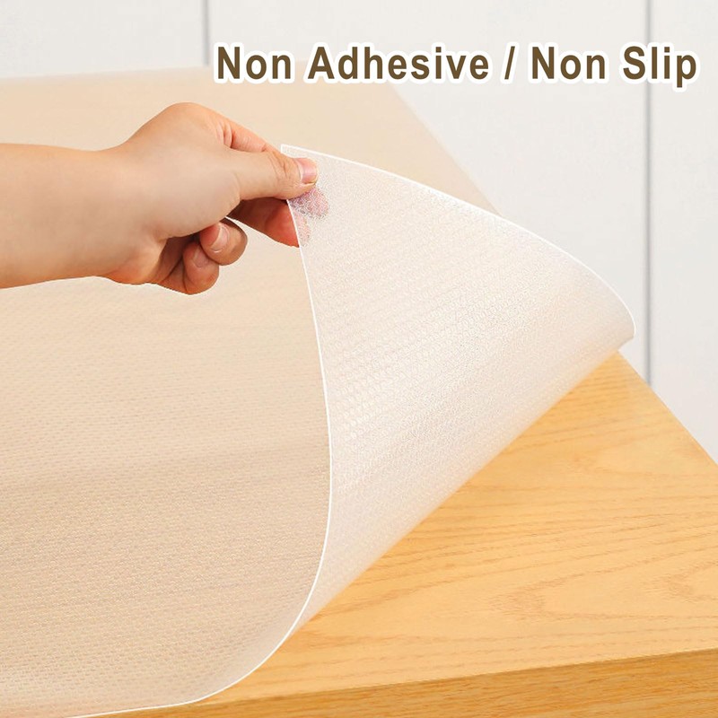 - Eextured Non-Slip: The surface of the cabinet drawer liner is designed with a circular mesh texture on one side, which can increase friction with other items and prevent glasses, cutlery or other fragile items from sliding off the tabletop, and the other side also grips the shelves well and is smooth and non-stick.