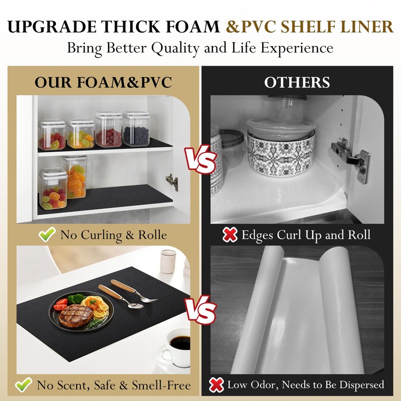 - SHOCK-PROOF& NOISE-REDUCING Shelf Liner: Made with upgraded foam + inner nylon mesh, this leather-like kitchen drawer liner cushions impacts, reducing noise by 30%. Perfect for protecting china, glasses, and cutlery in kitchen cabinets and drawers