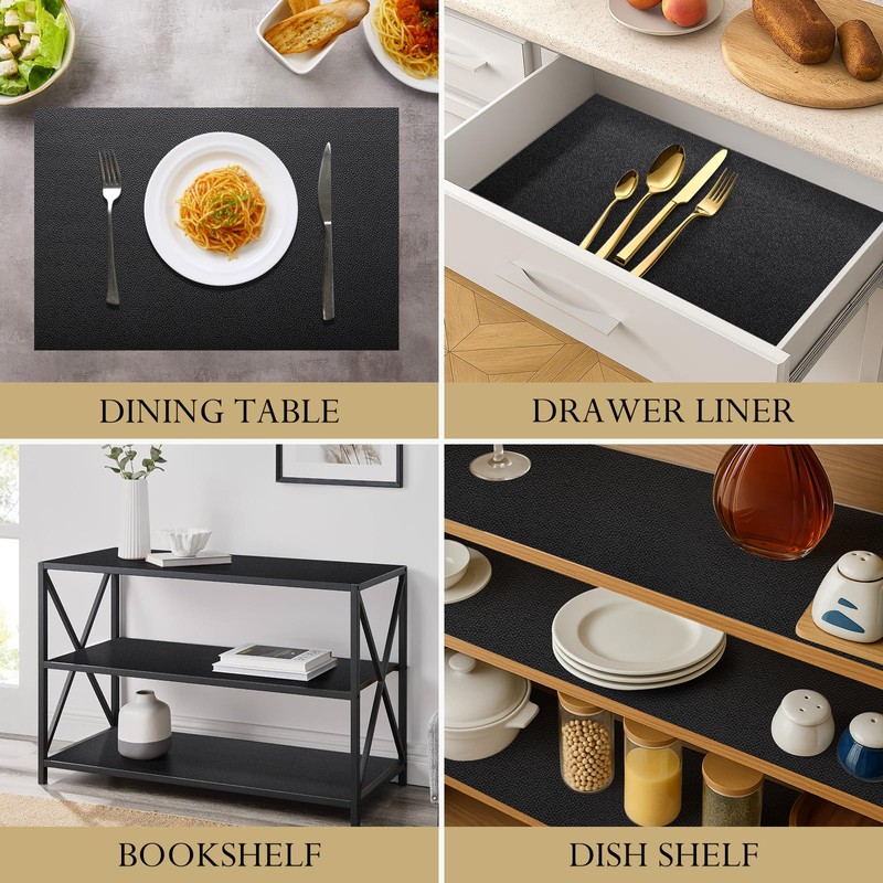 - DOUBLE-SIDED NON-SLIP GRIP Cabinet Liner: The bottom layer of the cabinet is designed with a grippy texture and the top layer is textured with premium leather. The double layer non-slip design perfectly secures your plates, bowls, knives, forks and cabinets. Add a beautiful and safe protection to your home