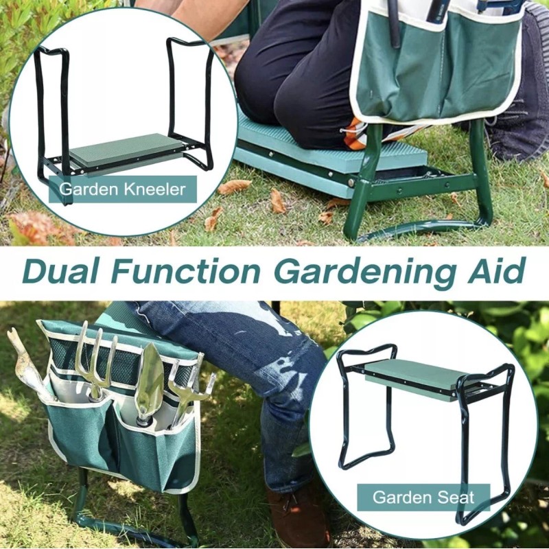 This garden tools there is one large removable tool pouch what has two pockets, It is very convenient to keep your tools into it from gardening activities. It is also easy to take down and use.It can convert to a garden chair and garden beach to prevent or improve back pain caused by standing for a long time.These incredible features make it an ideal gift for anyone who loves gardening.