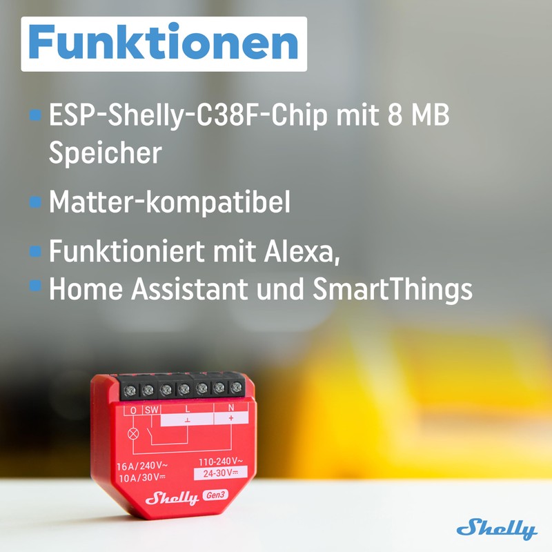 Shelly Shelly 1PM Gen3 | WLAN Relais-Schalter mit Strommessung - 16A | Lichtsteuerung | Alexa Google Home, Matter Kompatibel | iOS- Android-App | Kein Hub erforderlich