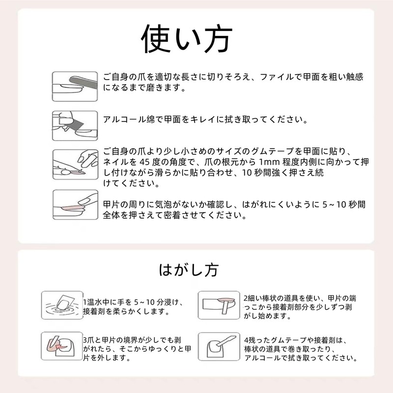 - (Comes with Luxurious Accessories for Easy Installation and Smooth Wholesale) Each set includes 24 nail tips, 48 double-sided tape for nails, 1 nail removal stick (wodstick), 1 nail polish stick (nail file) and 1 alcohol cotton. No manicure experience is required in 3 steps: Cleaning modification, Pasting, and Pressing